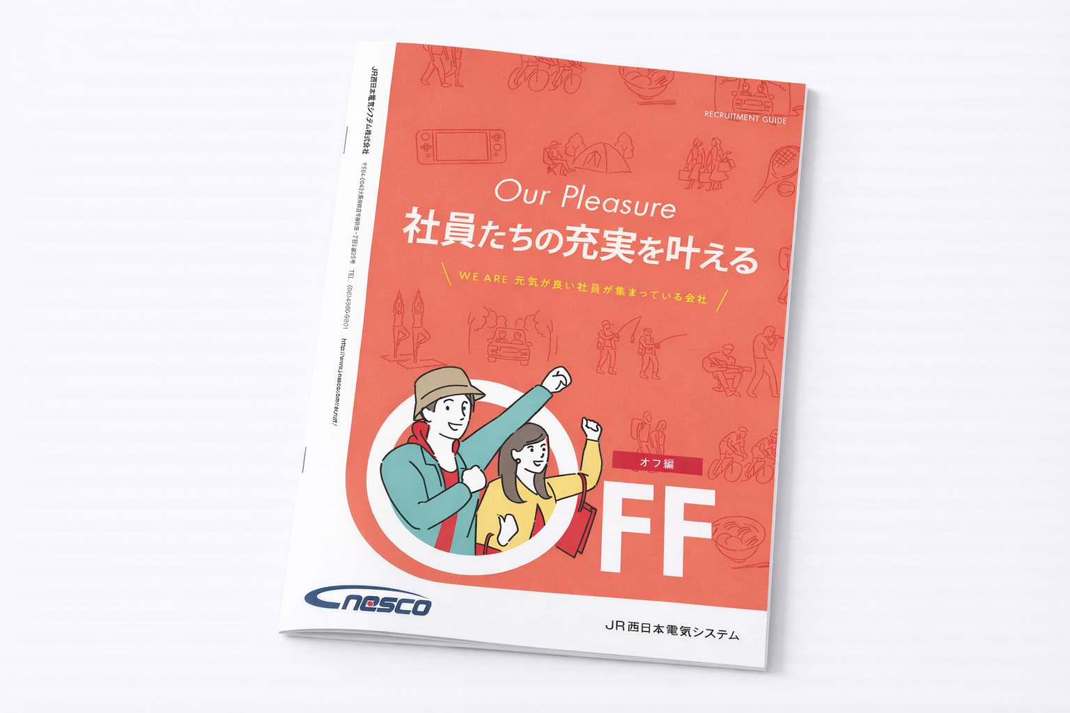 JR西日本グループの電気設備工事会社として鉄道電気設備工事・一般電気設備工事を手掛けるJR西日本電気システム様の大卒向け採用パンフレットの制作を請け負いました。職場環境はもちろん、福利厚生にも力を入れ、メリハリのある働き方を推し進めておられる同社について理解してもらうべく、「オン編」と「オフ編」を文字通り「切り替えながら読み進める」ことができるリバーシブルスタイルを採用しました。このリバーシブルスタイルは同人誌などで多く使われる手法です。1冊で2度おいしい、他には無い一冊に仕上がっています。